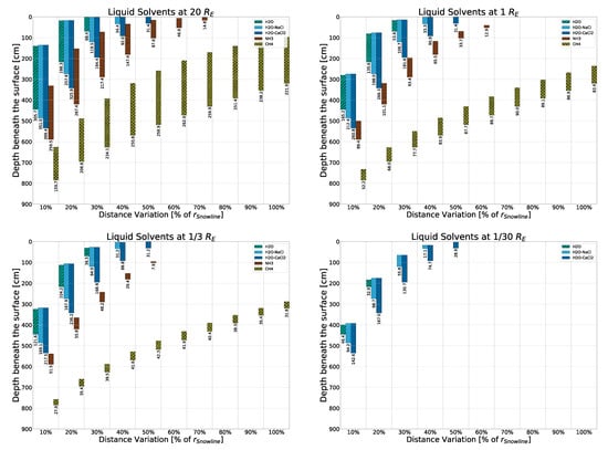 The results displayed in Figure 4 are a detailed breakdown of where and under what conditions, the discussed solvents would be liquid given the rocky, “lunar soil” model with freshwater ices. (Results for the other surface models as well as some further conditions considered can be found in Appendix B.) The four sub-plots seen show the sizes of model bodies considered in this work, from largest at 20 earth radii to smallest at earth radii. Smaller sizes are discussed in Appendix F.3 and Appendix F.4. Overall, the simulation was carried out over nine different size models (); however, only four representatives are shown in this paper to keep the sub-plots legible. The y-axes display model depth beneath the surface, with the surface itself (depth 0) placed at the top of each sub-plot. As previously mentioned, the simulation was carried out up to a depth of 10 m. The x-axes display groupings of the ten considered orbital distances between 10% and 100% . Within each of these groupings, the five different solvents considered are displayed with different colors/patterns. As such, the bars display where solvents would be liquid and are labeled with the respective bar’s length (representing the thickness of the liquid layer), taking both the subterranean pressure and temperature into account. We can then make some key observations based on these results as well as the ones explained in detail in the Appendices mentioned above: