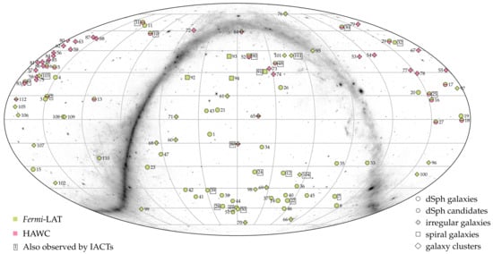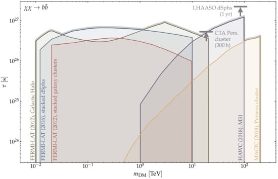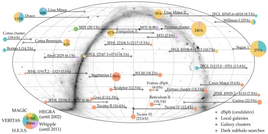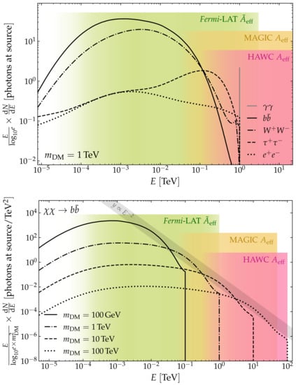- Oakes, L.; Armand, C.; Charles, E.; Mauro, M.D.; Giuri, C.; Harding, J.P.; Miener, T.; Moulin, E.; Kerszberg, D.; Poireau, V.; et al. Combined Dark Matter Search with Fermi-LAT, HAWC, HESS, MAGIC and VERITAS. In Proceedings of the 36th International Cosmic Ray Conference (ICRC2019), Madison, WI, USA, 24 July–1 August 2019; Volume 358, p. 12. [Google Scholar] [CrossRef]