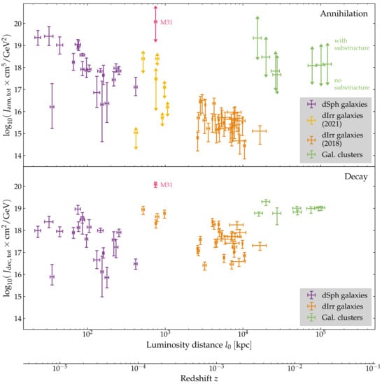 - Shirasaki, M.; Macias, O.; Horiuchi, S.; Shirai, S.; Yoshida, N. Cosmological constraints on dark matter annihilation and decay: Cross-correlation analysis of the extragalactic γ -ray background and cosmic shear. Phys. Rev. D 2016, 94, 063522. [Google Scholar] [CrossRef]