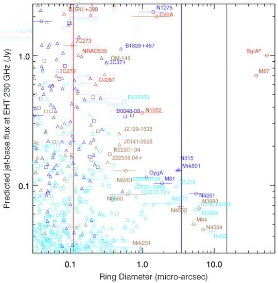 Jet-base targets for the EHT (cyan circles)—whose brighter subset are seen in more detail in Figure 2—primarily cluster at expected EHT 230 GHz fluxes of 2 to 30 mJy, and expected ring diameters of 0.005 to 0.5 arcsec. While these are identified via their cm-wave VLBI jet emission, note that in M87 the EHT showed that the 230 GHz nuclear emission is dominated by accretion inflow rather than jet base []. Remaining SMBHs with observed arcsec-scale resolution 230 GHz fluxes are shown in red. Here, those at smaller ring sizes are primarily bright sources from the ALMA Calibrator database (and likely dominated by jet emission at 230 GHz) but also include weaker sources: those at the largest ring sizes come primarily from our ongoing ALMA-ACA programs to directly measure 230 GHz fluxes. In the latter, the ∼5 arcsec resolution of ALMA-ACA means that the fluxes are potentially contaminated by dust from the host galaxy, so future ∼50 mas resolution ALMA observations of the brighter detections will be required to confirm their ADAF origin. For several hundred SMBH with large ring sizes, we currently do not have an accurate path towards estimating 230 GHz fluxes. Those at estimated ring sizes ≥ 2 arcsec are shown as blue circles (with an arbitrary flux value in the y axis in Figure 2): the number of these SMBH increases rapidly below this ring size but we do not show them to avoid crowding on the plot. These SMBH—divided roughly equally between nearby galaxies and high-z galaxies with large SMBH mass estimates from Rakshit et al. []—are the targets of our ongoing ALMA/ACA and SMA (proposed) programs. Finally, SMBH with 230 GHz fluxes predicted from our ADAF-only models are shown with green. Currently, these cluster at predicted fluxes of ≲10 mJy.