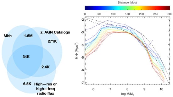 The ETHER sample (left panel of Figure 4) merges our collection of SMBH mass estimations, radio fluxes (VLBI, ALMA Calibrator database, literature, and our own work), of AGN and quasars identified in large catalogs (Section 2.1), and all ∼580 K galaxies in HyperLeda with V ≤ 25,000 km/s. Currently ETHER contains 1.9 million galaxies, of which 230 have a measured SMBH mass (from resolved stellar dynamics or gas kinematics), and ∼1.6 million have an indirectly derived estimate of the SMBH mass. The remaining galaxies are part of the sample due to being listed as an AGN or quasar in redshift catalogs, or for being a bright radio source, but are missing a redshift and/or a SMBH mass estimate. Of the 1.1 million SMBH estimations, 294 K are from M, 290 K from WISE M-L, 5 K from other (non-WISE) M-L, and 500 K from single-epoch RM (primarily from []). Focusing on galaxies at D ≤ 300 Mpc, ETHER currently includes 77,000 galaxies with an SMBH estimate. The mass function of these, in shells of 20 Mpc width out to 290 Mpc is shown in the right panel of Figure 4. At D ≤ 100 Mpc our mass function is in agreement with the ‘low’ theoretical mass function adopted by Pesce et al. [] except at the lowest masses. However, at larger distances we are increasingly incomplete at the low and higher mass ends. Ongoing SDSS-V (and future 4MOST) programs for spectroscopic observations of eROSITA sources, refinements of our WISE-derived SMBH mass estimates (Section 2.2) to lower signal to noise and/or W1-only detections, and the ingestion of further galaxy catalogs will help fill in this shortfall in the coming years.