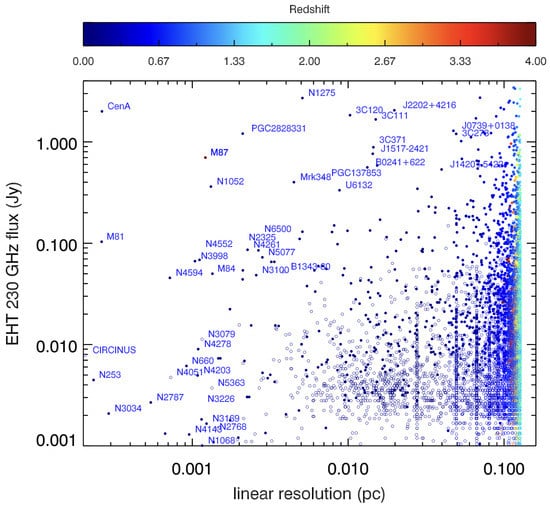 The estimated 230 GHz flux from the jet base—for VLBI detected sources only—as a function of linear resolution of the EHT assuming a 15 arcsec angular resolution: the EHT has a sub 0.2 pc resolution across the universe. EHT-Geo and EHT-L2 baselines would increase this by factor ∼4 and ∼130, respectively. Symbols are colored by redshift following the color bar, and some individual galaxies are named in uncrowded regions of the plot. Vertical striations are primarily due to redshifts with few significant digits in Véron-Cetty and Véron []. We expect to add a significant number of additional sources on this plot, both from new cm-VLBI detections, and for AGN with a bright accretion inflow.