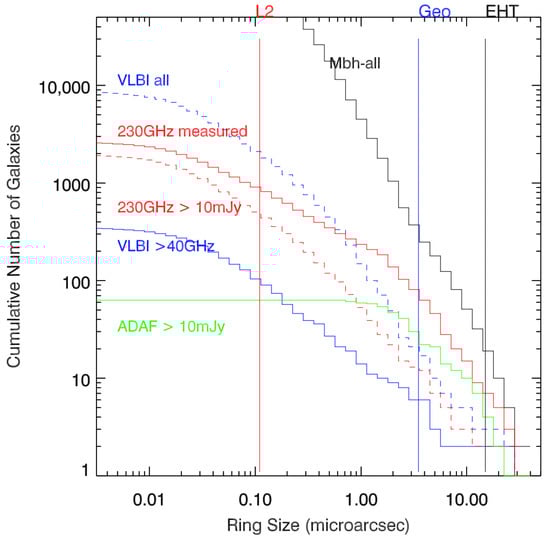 Cumulative histograms of ‘ring’ sizes in the ETHER sample. The intrinsic 15 arcsec resolution of ground EHT, geostationary orbit to EHT, and L2 orbit to EHT at 345 GHz will resolve the rings to the right of the black, blue, and red lines, respectively. The cumulative histogram of all 230 GHz flux measurements, and all 230 GHz flux measurements greater than 10 mJy, are shown with the red solid and dashed lines, respectively.