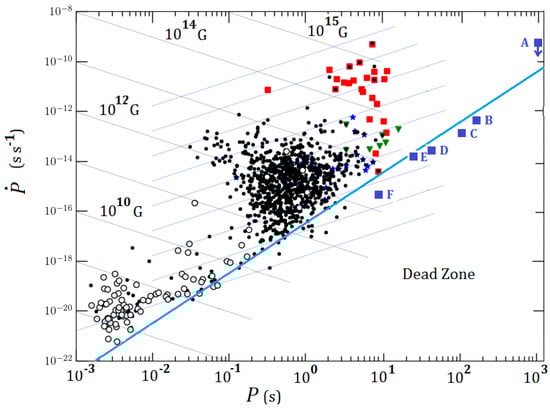 The diagram with the new objects. The diagram had to be extended up to periods of ∼ to accommodate the ultra-long period magnetar candidates. The symbols are as follows: ordinary pulsars (black dots), millisecond and binary pulsars (open circles), XDINSs (green triangles), RRATs (blue stars), Magnetars (red squares), and the new objects in blue squares. (A) GLEAM-X 162759.5-523504.3 [12], (B) AR Scorpii [43], (C) J0901-4046 [44], (D) J0250+5884 [45], (E) J2251-3711 [46], (F) J2144-3933 [47].