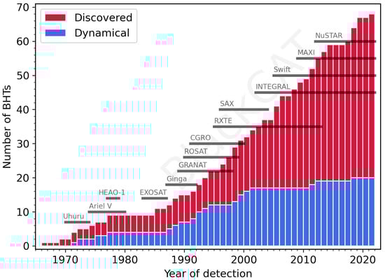 Cumulative histogram of discovered and dynamically confirmed BH candidates in X-ray transients, from the BlackCAT catalog [13], last updated in December 2021. In addition, the durations of X-ray missions that have discovered BH candidates in outburst are indicated.