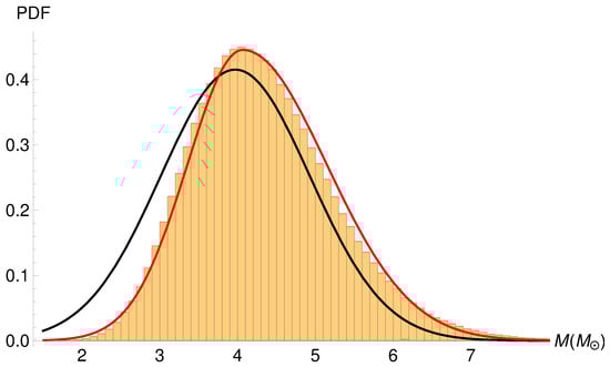 Monte Carlo generated masses from GRO J0422+32 (histogram), along with the Gaussian distribution from [99] (black line) and our fit of an asymmetric Gaussian (red line). The distributions N, are defined in the text.