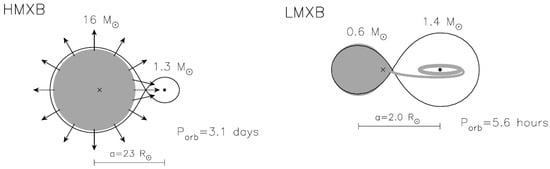 The discussion above leads naturally to the main distinction to be made among XRBs: low-mass X-ray binaries (LMXBs) and high-mass X-ray binaries (HMXBs). LMXBs are XRBs with luminous components with typical masses of or less, and so are restricted to RLOF accretion, which means that they virtually always contain an accretion disk (see the right side of Figure 5). Most, if not all, LMXBs are SXTs [103]. We also see it fit to mention here that the phenomenon of X-ray bursts (and their associated binaries, the X-ray bursters) are entirely distinct from the disk outbursts. Type I X-ray bursts are thermonuclear in nature, similarly to novae, and can only occur in NS-hosting XRBs. For the less well understood Type II X-ray bursts, disk instability models have been proposed, but are not favored (see [112] for a review of some current proposals).