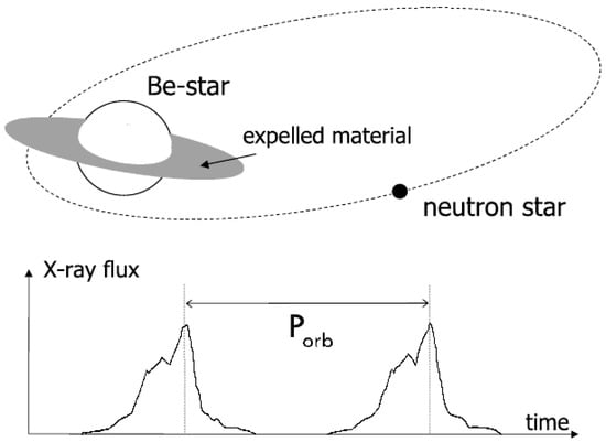 HMXBs contain massive companions (≳10 ) and generally undergo wind-fed accretion (see the left side of Figure 5), but can also accrete from RLOF, and form a disk. Even when they do have a disk, HMXBs rarely show disk instability outbursts because companion stars of type O or early B are themselves potent enough sources to keep the entire disk ionized (). Outbursts can then still occur if the components are distant enough during the orbit, i.e., if the period is longer than ∼10 d [108], or for high-eccentricity orbits. These conditions are found in the particular class of Be X-ray binaries [113], in which the compact object accretes matter for the Be star’s own circumstellar disk; in this case, outbursts are regularly observed and probably caused by a burst of accretion near periastron (Figure 6). Although for some time only Be-NS binaries could be found, the first Be-BH binary was discovered in 2017 by Ribó et al. [114].