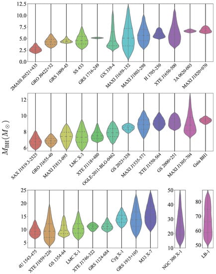 Indirect observation of BHs in non-interacting binaries can still occur through the monitoring of the companion’s motion, and the masses of three BHs in our sample have been constrained in this manner. Observation of isolated BHs is also possible from the microlensing of background light, but only one such event, which we have also included, has been confirmed so far to have been caused by a BH. Low-frequency Quasi Periodic Oscillations (LF QPOs) in the X-ray spectrum provide yet another way to measure the mass of a black hole in a XRB. QPOs appear in the power spectrum as narrow peaks and evolve through outbursts, with LF QPOs appearing with ≲ (for a review of QPOs and their different classes, see [15]). XRB spectra can often be fitted by the superposition of a blackbody component and of a power law component [120], and Titarchuk and Fiorito [121] produced a BH mass-dependent model which correlates the fitted photon index of the power-law component to the observed LF QPO frequency . This model has since also been used to measure the mass of XRBs in which LF QPOs are observed.