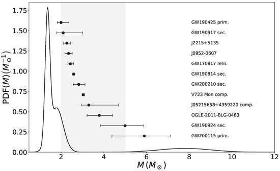 At the same time, the determination of masses of NSs and BHs with good accuracy in larger samples has allowed a better glimpse of the astrophysical processes that lead to their birth. This is indeed a long-term task, since many complicated issues in the evolution of progenitors and explosions themselves are involved. We shall not address these issues here, but rather indicate some recent works that illustrate the state-of-the-art understanding of them. The connection with the compact star features is also dependent on the binarity of forming systems to a high degree, and in fact it is in binaries (in which one of the members is generally non-compact) where most of the masses (and some radii for NSs) have been measured. Last, but not least, the production of NSs by accretion induced collapse [20,21,22] is not properly understood but may be important for the whole picture, as we shall see. All these issues are entangled when we have to address, for example, the suggested absence of objects between 2 and , a paucity called lower mass gap in the literature [23,24,25,26,27]. We shall address the existence of a mass gap below according to analyses of the latest data [28,29,30]. Finally, a novel form of “seeing” compact objects is the now systematic monitoring of gravitational-wave events. Great insights on NS matter have been gathered from the event GW170817 and a substantial set of compact binary masses has been collected through three LVK runs, and these we also discuss briefly.