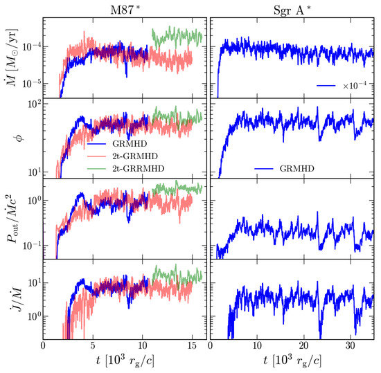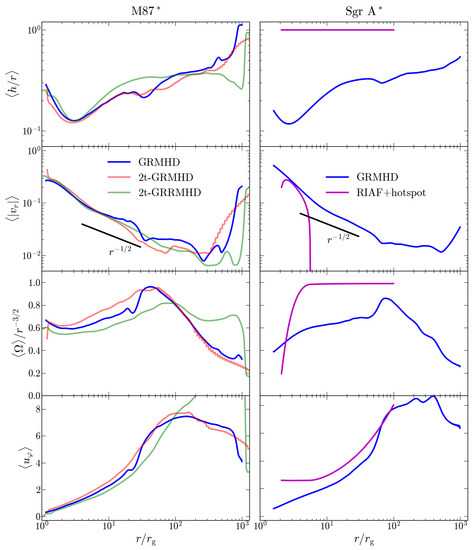 - Sądowski, A.; Wielgus, M.; Narayan, R.; Abarca, D.; McKinney, J.C.; Chael, A. Radiative, two-temperature simulations of low-luminosity black hole accretion flows in general relativity. Mon. Not. R. Astron. Soc. 2017, 466, 705–725. [Google Scholar] [CrossRef]