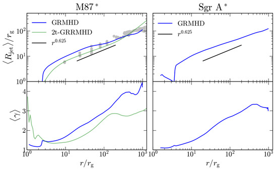 - Chatterjee, K.; Liska, M.; Tchekhovskoy, A.; Markoff, S.B. Accelerating AGN jets to parsec scales using general relativistic MHD simulations. Mon. Not. R. Astron. Soc. 2019, 490, 2200–2218. [Google Scholar] [CrossRef]