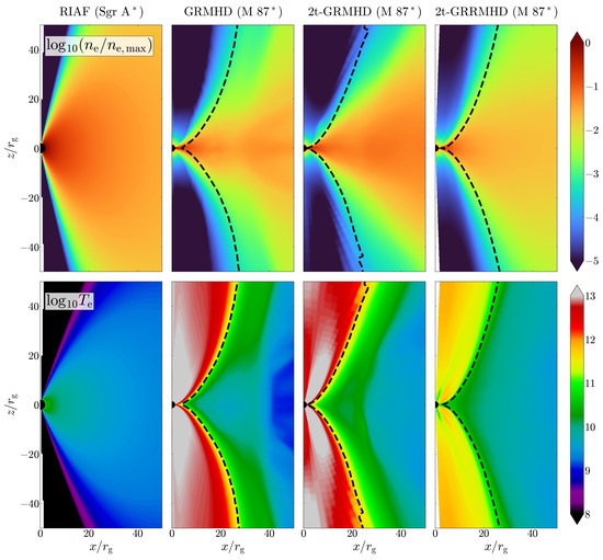 - Mizuno, Y.; Fromm, C.M.; Younsi, Z.; Porth, O.; Olivares, H.; Rezzolla, L. Comparison of the ion-to-electron temperature ratio prescription: GRMHD simulations with electron thermodynamics. Mon. Not. R. Astron. Soc. 2021, 506, 741–758. [Google Scholar] [CrossRef]