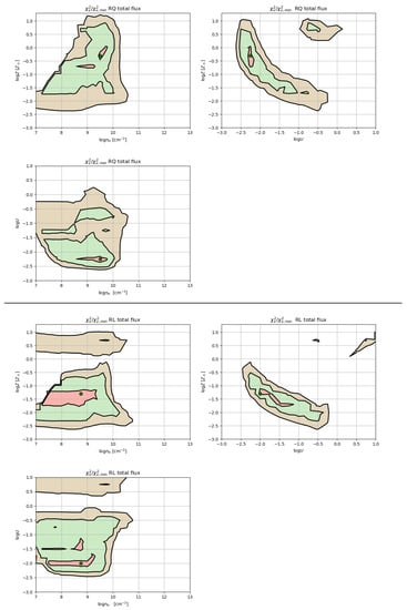 Projections of the 3D parameter space , U, Z. Isophotal contour traces the 1,2,3 confidence levels; the green spot identifies the values of , U, Z yielding the minimum . The upper panels are for RQ, lower panels are for RL. Regions of the parameter space where [OIII]5007/H have been assigned a very high .