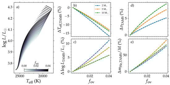 Illustration of the effect of increasing the size of the CBM region assuming exponential diffusive overshoot. (a) HR diagram showing the evolutionary tracks for a 10 M star with different extents of the CBM region. is a low value, whereas is considered a high value for this parameter. (b) Percentage change in the effective temperature at the TAMS compared to the case for three different initial masses. The parameter sets the extent of the CBM region and how rapidly the mixing decreases with distance from the convective core boundary; see Section 2.4. (c) Same as (b) but for the luminosity at the TAMS. (d) Same as (b) but for the age at the TAMS. (e) Same as (b) but for the helium core mass obtained at the TAMS. Figure made by the authors using MESA models. MESA inlists and data used to generate the figure are available on Zenodo [33].