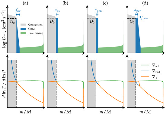 Extended convective penetration [64,65] combines convective penetration and diffusive exponential overshooting; see Figure 2d. In this formalism, the convective boundary mixing region has two components. The convection zone is adjacent to a convective penetrative region with constant mixing and an adiabatic temperature gradient. Further from the convective boundary, the mixing exponentially decays and the temperature gradient gradually transitions from to . The exact mixing coefficients are