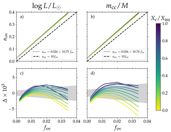 Here, we provide a comparison between models computed with the stellar structure and evolution code MESA v22.05.1 for a 2 M and 10 M star assuming (1) exponential diffusive overshoot and (2) diffusive step overshoot. Using these models, we investigate what parameter is required to reproduce the same luminosity and convective core mass (, the mass coordinate of the Schwarzschild boundary of the convection zone) of the star with exponential diffusive overshoot at a fixed value of . These comparisons are carried out at fixed main-sequence age () and stellar mass. In other words, we look for solutions to the relations and . Here, is the current core hydrogen mass fraction and is the initial hydrogen mass fraction. An example of these solutions is shown for the 10 M star in Figure 3. Panels a and b show the derived relations for the luminosity and convective core mass, respectively, at different main-sequence ages indicated by the color of the lines. The black dashed curve shows the expected trend assuming the standard “rule-of-thumb” , whereas the black dotted line shows the linear fit to the derived relations. The differences between the linear fits and relations derived at different ages are shown in panel (c) and (d), where the gray shaded region gives the uncertainty regions for the relations. As seen in the figure, the relations are not strictly linear and also show a small dependence on the chosen in the current core hydrogen mass fraction and value.