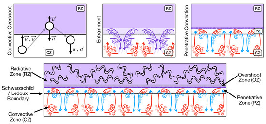 We will use this energetics framework to describe three processes that can occur in hydrodynamical CBM. These processes are depicted in Figure 4, and parallels can be drawn between these processes and the prescriptions in Section 2. The first process is a small-scale conversion of convective kinetic energy into potential energy beyond the boundary, which is referred to as “convective overshoot”. The second is a process wherein either kinetic energy or buoyant work are used to increase the potential energy of the convection zone, which is referred to as “entrainment”. The third process occurs in a statistically stationary state where , and a balance between work producing energy and dissipation is achieved; this process is called “convective penetration”. We note that there is a great deal of degeneracy in the literature studying these processes, and these terms (in particular “overshoot” and “penetration”) are often used interchangeably; note that when we use these terms in this review, we are referring to distinct processes. As in the bottom panel of Figure 4, we will assume that the stellar structure consists of a convection zone (CZ, ) and a radiative zone (RZ, ), and that the CBM region consists of both a penetrative zone (PZ, ) and an overshoot zone (OZ, ). We note that the convection zone itself could also have an additional structure (e.g., “Deardorff zones”, see Ref. [111]), but we do not include that level of detail here.