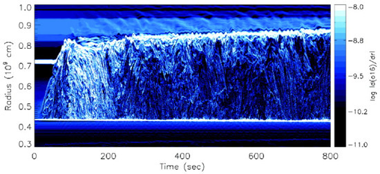 where the logarithmic temperature gradients are defined in Section 2.2. This definition is useful in simulations where convection is driven by an unstable temperature gradient which achieves by, e.g., an enforced boundary condition, but it is less useful in describing convection in the cores of massive stars where . Recently, a dynamical definition of the stiffness has been favored by some authors [114,115,116],
