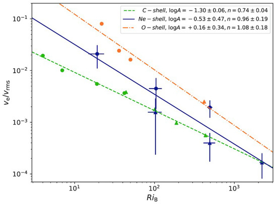 where is the radiative diffusivity of the fluid. The associated argument suggests that CBM regions have an adiabatic penetration zone where is large as well as a “thermal adjustment layer” where . The size of the CBM region is expected to scale like for the adiabatic penetration zone and like for the thermal adjustment layer [113]. While these scalings were observed by early simulations (e.g., [125,126]), they have not appeared in more recent simulations [119,120]. Main-sequence convection is very turbulent with bulk [5], so it is hard to imagine that a large thermal adjustment layer should appear at the radial location where convective flows have damped to the point of becoming laminar ().