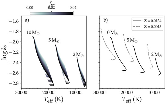 - Claret, A.; Torres, G. The Dependence of Convective Core Overshooting on Stellar Mass: Reality Check and Additional Evidence. Astrophys. J. 2019, 876, 134. [Google Scholar] [CrossRef]