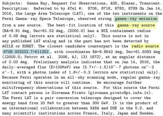 An example message from ATel. Named entities are marked with color: ■ object name; ■ the type of the object or physical phenomena; ■ event type. Taken from Ref. [1].