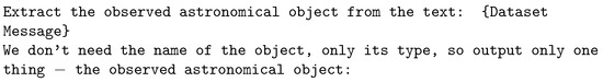 For example, in the case of NER, a prompt could be designed to guide the model to identify specific entities such as “astronomical objects’ names” or “astronomical event types” in astrophysical reports. Similarly, in the case of classification, a prompt could be designed to guide the model to classify reports based on their content.