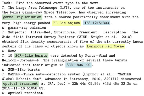 This research is based on the publicly available data from The Astronomer’s Telegram (https://astronomerstelegram.org/ (accessed on 28 February 2023)) and NASA GCN circulars (https://gcn.nasa.gov/circulars (accessed on 28 February 2023)). We are gradually releasing the source code and prediction results in our publicly available GitHub repository: https://github.com/JetBrains/lm-astronomy (accessed on 28 February 2023).