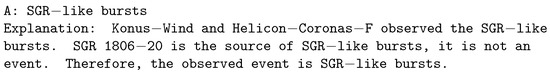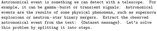 The second type of prompt is based on using examples in prompts, e.g., mentioning possible event types or astronomical object names. It was utilized to show the model the type of entities we wanted to see in the output - to help it differentiate between different entities. However, in case the required entity is absent in the astronomical observation, the model is prone to use one of the entities mentioned in the prompt, leading to the wrong answer. That led to a third type of prompt—“few-shot” prompts. These prompts contained the description of the task and several short astronomical texts with desired answers (example shown on Figure 3). This way, we can give a general description of the desired entity through examples as well as mention some borderline cases, such as the absence of the required entity.