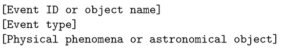 - GCN: The Gamma-ray Coordinates Network. Available online: https://gcn.nasa.gov/ (accessed on 28 February 2023).