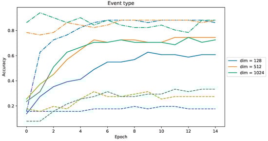 As for the methods for comparing the model’s outputs, the embedding ranking pipeline has shown the best performance compared to previous methods. As shown in Figure 9, we used MSELoss (minimizes squared L2 norm between embeddings of a prediction and correct answer) is represented by the solid line, ContrastiveLoss (minimizes squared L2 norm between embeddings of a prediction and correct answer, maximizes squared L2 norm between embeddings of a prediction and wrong answer) by the dashed line, and TripletMarginLoss (minimizes squared L2 norm between embeddings of a prediction and correct answer, maximizes squared L2 norm between embeddings of a prediction and wrong answer, plus adds a regularizing margin parameter). The highest accuracy is achieved by using TripletMarginLoss during training, with the hidden layers’ dimension of 512. The pipeline has shown itself to be suitable for practical tasks: it requires a low amount of labeled data (100–200 text messages) to learn a new entity category. However, it is computationally intensive.