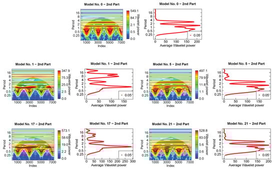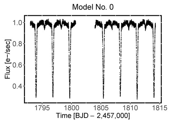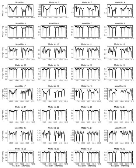 - For the wavelet analysis, each light-curve model was separated into two parts because they present a discontinuity (or a gap) in the time sequence (see Figure 3). For all periods that showed a maximum average wavelet power greater than 10, the mean value of each period across time and its standard deviation were calculated as suggested by Roesch and Schmidbauer [51]. The latter was used as a measurement uncertainty of the period. They were considered more or less significant according to the color code of the scalogram, even those outside the cone of influence, since there is a significant improvement in the reconstruction of the light curves when considering those periods as well [37]. The period’s harmonics were identified for all independent periods. For the harmonics of the orbital period, we searched for the values included in the intervals with endpoints given by FWHM (see Table A2), where is an harmonic in the Model No. 0 and FWHM, being FWHM the full width at half maximum of a normal distribution with standard deviation at any expectation value.