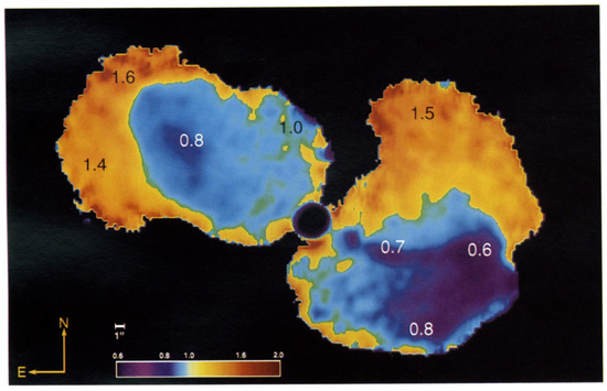 1.4–5 GHz spectral index map of 3C 388, presented by [57]. The sharp transition from flat (~) to steep (~) spectral indices can be seen between the regions coloured in blue and orange. © AAS. Reproduced with permission.
