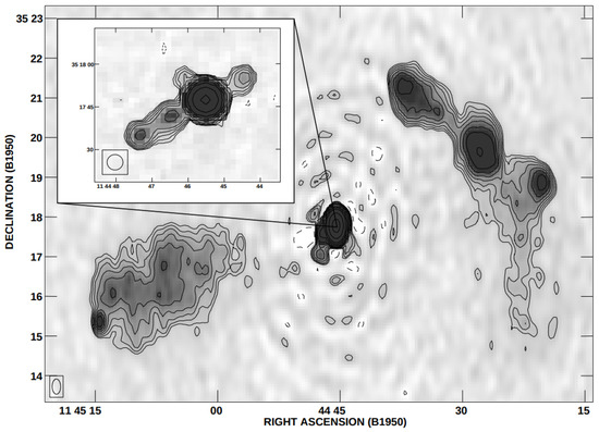 Radio maps of the restarting source B1144 + 352 at 1.4 GHz from [75]. The inset shows a high resolution image of the central GPS source, showing evidence of an edge-brightened restarting jet. Reproduced with permission © ESO.
