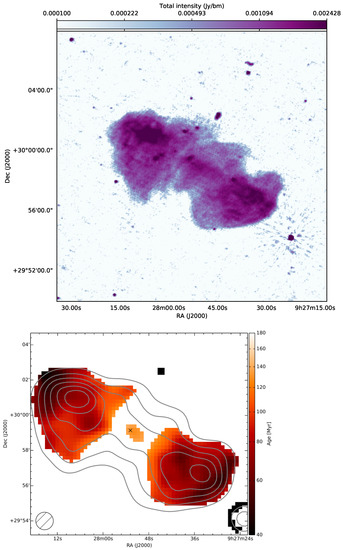 The well-studied remnant source B2 0924 + 30. Top: 144 MHz total intensity map observed in the LoTSS survey at 6 arcsec resolution, from the publicly available archive of DR2, accessed in January 2023. https://lofar-surveys.org/dr2_release.html, accessed on 25 May 2023. Bottom: radiative age map by [95] at 1 arcmin angular resolution.