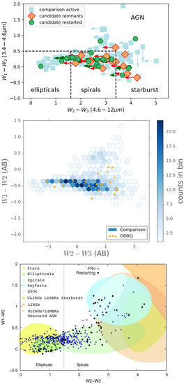 WISE colour–colour plots for the host galaxies of remnants and restarting sources (top [118]; bottom [120]) and DDRGs (middle [117]) compared with those for the parent samples of RLAGN. Both studies that select samples heterogeneously from the same survey but with different selection methods (top and middle) replicate the conclusion that interrupted radio jet activity is not a consequence of being hosted by different types of galaxies, a conclusion based on optical and infrared photometric properties.
