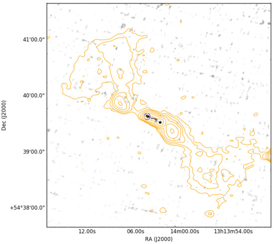 The source ILTJ131403.17 + 543939.6 from the DDRG sample of [117], showing evidence of a third episode of activity based on the diffuse extended plasma beyond the outer double. Greyscale image: 6 GHz VLA data showing the inner restarting double. Orange contours: 144 MHz LOFAR data.