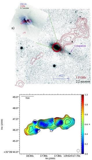 There are few sources that show a combination of all the suggested properties of restarting sources. One of the most well-studied sources, 3C 236, is known to have elongated edge-brightening in the northern lobe [101,189], repeated bursts of star-formation in its host galaxy [190], an inner CSS source [190], and fast outflows of cold molecular gas and atomic hydrogen [77,87], all of which are associated with young radio jets. Another example is 3C 293, which is known to have asymmetric large scale lobes at a size of ~220 kpc and a bright steep-spectrum core on arcsec scales, though on sub-arcsec scales the core is resolved into a double-lobe structure ~4.5 kpc in size [102] on either side of a flat-spectrum core [103]. With the source being hosted by a post-merger galaxy with multiple dust lanes [191] and large amounts of cold gas in the region of the inner double (incidentally, the first detection of CO emission in an FR-II source was in 3C 293 by [192]; see top panel of Figure 8), 3C 293 [104,192,193] is another prototypical example with multi-wavelength evidence of restarted activity. Recently, further strides have been made towards harnessing the full international array of LOFAR, providing baselines of ≳. Calibration of the international stations with the High Band Antennas (HBA) at a central frequency of 144 MHz [194] has facilitated further spectral ageing studies at an unprecedented angular resolution down to ~ arcsec. In [106], such observations were used to provide highly resolved spectral aging maps of 3C 293 down to 0.2 arcsec scales (see the spectral index map in the bottom panel of Figure 8), confirming the restarted nature of the inner double with a spectral age of ≲ Myr, which is a CSS source that is absorbed due to a rich ISM.