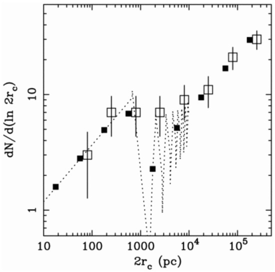 Radio source size function from the dynamical models of intermittent radio sources by [243] (dotted line and binned as black filled squares). Open squares show the data from the CSS/GPS sample by [56], showing the plateau in sizes at ~1 kpc, approximately consistent with theoretical models of intermittent radio sources showing fine structure related to the number of intermittency cycles.