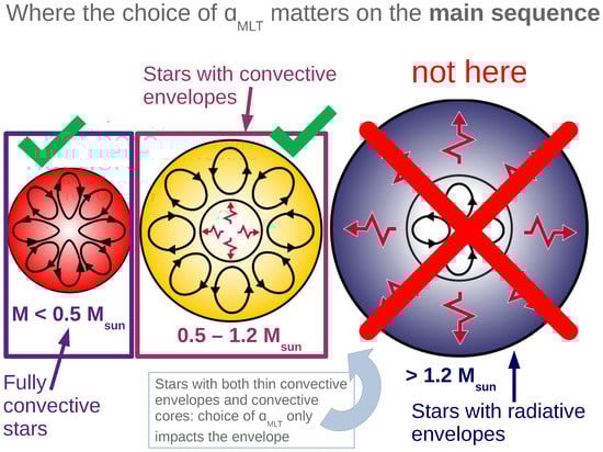 Stellar modelers typically classify main-sequence stars according to mass, in three main categories: those that are fully convective (stars less than about 0.5 ; e.g., M dwarfs); those that have radiative cores and convective envelopes (–1.2 , or stars like the Sun); and those that have convective cores with radiative envelopes (>1.2 ). Figure 1 depicts the “convective configurations” of main-sequence stars of various mass. Mixing length theory is used to characterize energy transport in stars of all masses and all regions therein, but the choice of is only important for models in the lower two mass categories, and not in the third. It is also important in models of, e.g., F-type stars, which host a thin convective envelope as well as a convective core, with a radiative zone between them. In this case, MLT is only relevant to the outer convection zone.