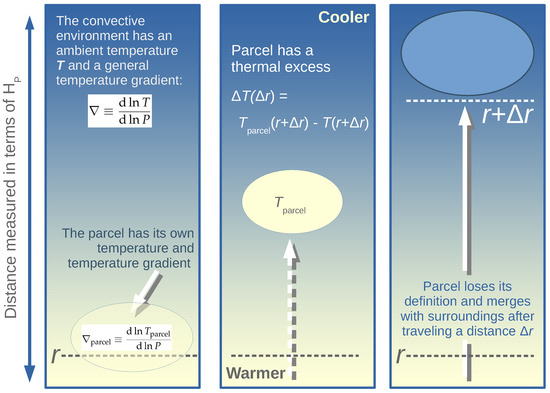 The mixing length theory of convection describes the bulk movement of fluids in analogy with molecular heat transfer. By considering a pocket within a convection zone as a discrete “parcel” of fluid, with locally uniform physical characteristics, we may trace its vertical displacement. Assuming the parcel is in pressure equilibrium with its surroundings but not in thermal equilibrium, a relatively hot parcel will move towards a cooler region, and cooler parcels will move towards hotter regions. As hot parcels are under-dense relative to their surroundings, it is a buoyancy force that causes them to rise and expand. Cooler parcels, on the other hand, sink and compress. The characteristic distance over which such a parcel can travel (along a radial line, in one dimension) before losing its locally homogeneous physical characteristics can be thought of as the mean-free path of that parcel, measured in terms of the pressure scale height, , of the stratified fluid.
