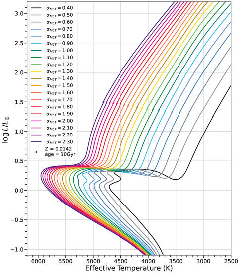 - Song, N.; Alexeeva, S.; Sitnova, T.; Wang, L.; Grupp, F.; Zhao, G. Impact of the convective mixing-length parameter α on stellar metallicity. Astron. Astrophys. 2020, 635, A176. [Google Scholar] [CrossRef]