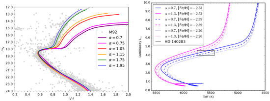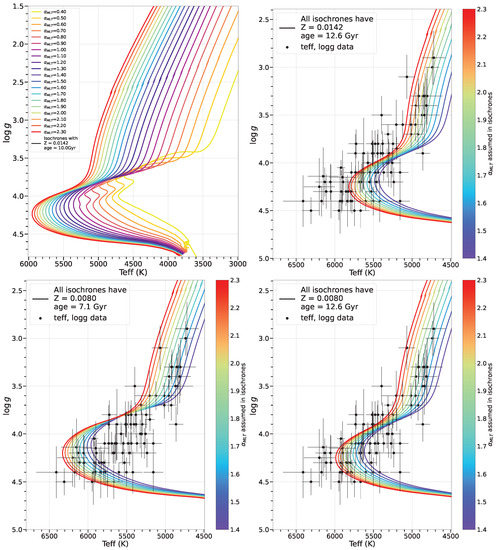 - Pietrinferni, A.; Hidalgo, S.; Cassisi, S.; Salaris, M.; Savino, A.; Mucciarelli, A.; Verma, K.; Silva Aguirre, V.; Aparicio, A.; Ferguson, J.W. Updated BaSTI Stellar Evolution Models and Isochrones. II. α-enhanced Calculations. Astrophys. J. 2021, 908, 102. [Google Scholar] [CrossRef]