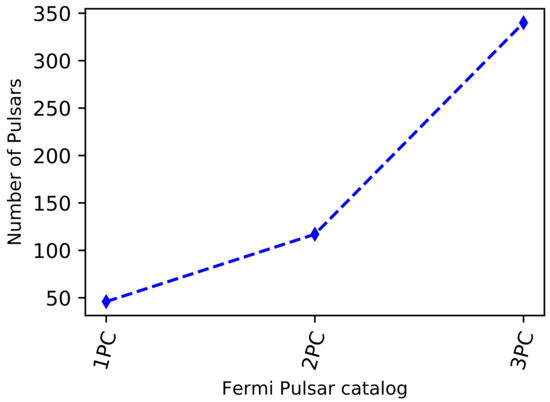 Until 2008, pulsed gamma ray emission was mainly detected from pulsars that were initially observed in lower energy bands. Therefore, discovery and identification of new gamma ray sources was the main science goal of the Fermi-LAT [53]. Due to its large field of view of ∼2.4 sr, the Fermi-LAT completes continuous mapping of whole sky in about 3 h in survey mode. Therefore, observations of a few weeks to a few months are sufficient to build an average pulse profile for confirming a gamma ray source as a pulsar. The photon collection by the Fermi-LAT, with an accuracy better than 1 s, helps in the detection of even rapid pulsations from millisecond pulsars. The first Fermi-LAT pulsar catalog (1PC) containing 46 high-confidence pulsed detections in the energy range 0.1–300 GeV was released in 2010 using only the first six months of its observation [54]. This included the discovery of 16 new gamma ray pulsars and confirmation of pulsed gamma ray emission from 24 known pulsars. Subsequently, 117 gamma ray pulsars with high-confidence detection at energies above 0.1 GeV were reported in the second Fermi-LAT pulsar catalog (2PC) using the first three years of data [55]. This sample of 117 gamma ray pulsars was divided into three classes: MSPs, young radio-loud and young radio-quiet pulsars. The more recent third Fermi-LAT pulsar catalog (3PC) identifies roughly 340 gamma ray pulsars using 12 years of data [52], which is approximately 10% of known pulsars. The increase in number of gamma ray pulsars detected by the Fermi-LAT so far is depicted in Figure 2. It is evident that the population of gamma ray pulsars has continued to grow after the launch of the Fermi satellite. The diagram of the gamma ray pulsars suggests that a large fraction of the Fermi-LAT detected pulsars can be identified as rotation-powered radio-loud MSPs [56]. Moreover, a significant fraction of these pulsars exhibit no emission in the radio band, hence the name radio-quiet pulsars. A comparative study of this relatively large population has led to new understanding of the emission process and geometry of the gamma ray pulsars [57]. The differential energy spectra of pulsars in the energy range 0.1–1 TeV, measured by the Fermi-LAT, are significantly curved and can be well fitted with a super-exponential cut-off power law of the form [58]