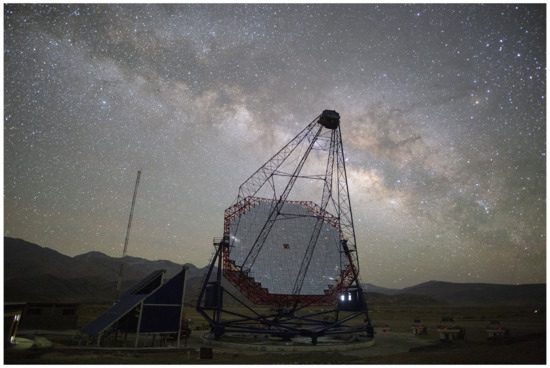 The Major Atmospheric Cherenkov Experiment (MACE) is an extremely large state-of-the-art gamma ray telescope located at an altitude of ∼4.3 km at Hanle, Ladakh, India. The telescope was commissioned in September 2021 after its successful first light from the standard candle Crab Nebula in April 2021 [70]. Subsequently, various operating parameters of the telescope were optimized and tuned using a large number of engineering runs and repeated observations of the Crab Nebula. The telescope has been deployed for science data collection for more than one year. During this period, it has successfully detected high-energy gamma ray photons from a number of candidate sources, including the recent giant flaring episode of the radio galaxy NGC 1275 in December 2022 and January 2023 [71,72]. The MACE telescope is designed to cover the high-energy gamma ray band above 20 GeV with a point source sensitivity better than the existing stand-alone imaging atmospheric Cherenkov telescopes (IACTs) in the world [73,74]. At present, the telescope is capable of detecting high-energy gamma ray photons from the Crab Nebula with a sensitivity of 5 in a few minutes (internal communication) in the energy range above 50 GeV. A picture of the MACE telescope at Hanle is shown in Figure 3. It is equipped with a big quasi-parabolic light reflector of 21 m diameter and 25 m focal length. This offers a total light collection area of ∼340 . Such a large area is achieved by using a tessellated structure comprising 356 mirror panels of size 0.986 m × 0.986 m each. Each panel consists of four square-shaped spherical metallic mirror facets of size 0.488 m × 0.488 m each [75], with similar focal length. The reflecting surface of the mirror facets, coated with a protection layer of of thickness ∼120 nm, has an average reflectance of ∼85%. An active mirror alignment control system employing linear actuators and diode lasers fitted on each panel is used to obtain the best possible parabolic approximation and optimum focusing in all orientations of the basket. An imaging camera at the focal plane has an optical field of view of and a uniform pixel resolution of 0.125. It consists of 1088 photo-multiplier tubes (PMTs) with high quantum efficiency (above 30%) and medium gain (∼10). The MACE camera is a custom-designed, event-driven system with state-of-the-art technologies for in-house signal processing electronics and high-speed data acquisition. The entire telescope structure is supported by an altitude-azimuth drive system. With the telescope’s moving weight of 180 ton, the drive system enables the pointing and tracking of a gamma ray source with an accuracy of ∼1 arcmin in the presence of wind blowing at a speed of up to 45 km/h. A data archival storage system with a capacity of 80 TB is housed in the control room at the telescope site for safe and secure storage of the MACE data as a large data volume of ∼50 GB is generated during every hour of observation.