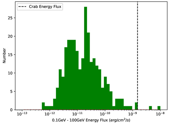 Histogram of energy flux of the Fermi-LAT pulsars in the energy range 0.1–100 GeV.