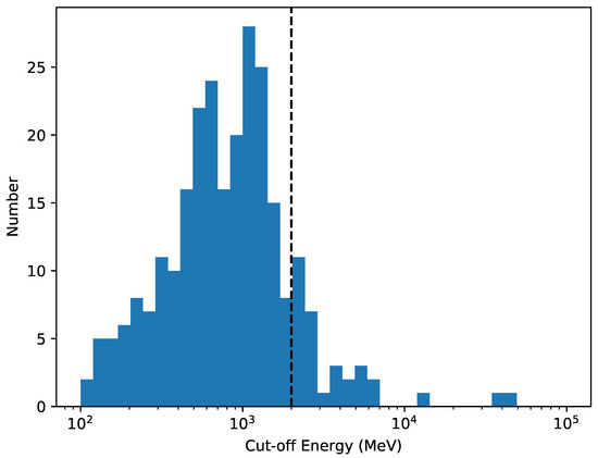 Histogram of the cut-off energy of the Fermi-LAT pulsars. The vertical dotted line indicates 2 GeV.