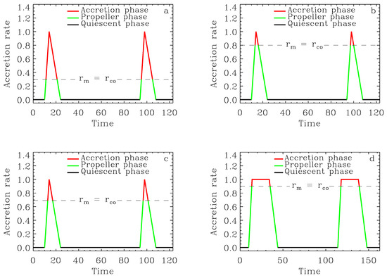 During the rise of an outburst, when the value increases by several orders of magnitude, the disk approaches the star, and decreases. Thus, the source could pass through , and conditions. These conditions should occur in the opposite order during the outburst decay. The condition (dashed horizontal line in Figure 1a–d) separates the accretion phase from the propeller phase. The former phase () is for values above the dashed horizontal line, while the latter phase () is for values below this dashed horizontal line. Since is a function of , whether for a given value the source will be in the accretion phase or in the propeller phase depends on .