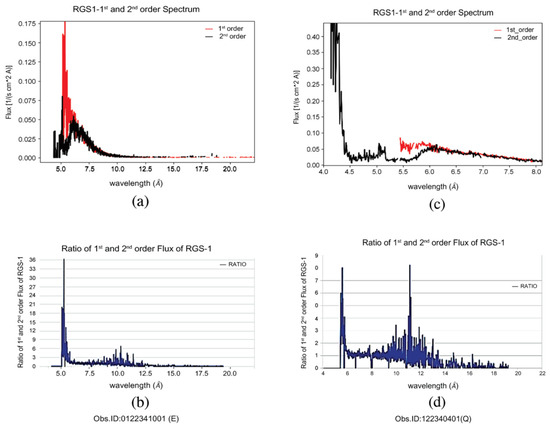 Data piling can be estimated either using the method described in SAS threads or via the method used by de Vries (2006) [32] and Cacket et al. (2008) [33]. We opted for the second method here, since in the first method, the estimation of pile-up is carried out by visually comparing the spectra obtained from fluxed files derived from ‘rgsproc’, and thus the method is subjective. Additionally, since the RGS2 CCDs are read via a single node while RGS1 is found in a double node, the chances of piling in RGS2 are always high (XMM-user manual). Therefore, in our analysis, we have not used data of RGS2 to avoid the possibility of adding pile-ups in the process (RGS-SRON-CAL-ME-06/001, Issue dt. 2 November 2006). Using the ‘rgsfluxer’ command, we created separate first-order and second-order fluxed files of RGS1, and then we created a comparison plot to observe how the strength of the first and second-order flux varied with respect to each other at different wavelengths (Figure 1a,c). Further, the ratio of first-order and second-order flux of each RGS is obtained. The flux ratio thus obtained is then plotted against the corresponding wavelength (Figure 1b,d). If the value of the flux ratio lies close to 1 it indicates that piling is at the lowest level or that the data is free from X-ray loading.