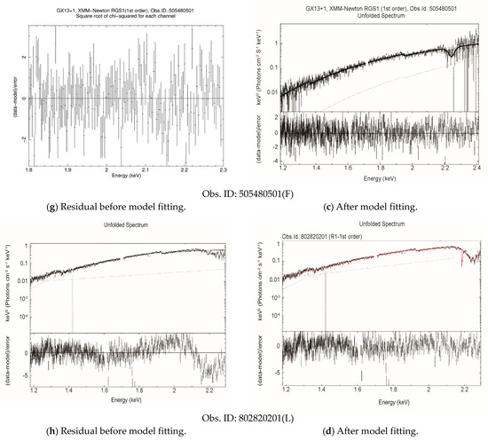 As shown in Figure 2a, a clear dip can be noticed at the beginning of the observation 0505480501(F). This is the same dipping that was reported by Trigo et al. (2012) [20]. It is clear from the curves that the shape of the hard and soft light curves plotted by Trigo et al. (2012) [20] using EPIC-PN data or as carried out by us using RGS data looks almost similar except for the counts/s. Apart from this, we noticed new dipping activity towards the end of the off-axis observation 0122340701(B), where counts s−1 seem to drop by ~2. The time unit is expressed in hours since the observation began. The bin time is considered to be 60 s in each case. The newly observed dip can be seen in Figure 2b at around 23:36 h on 3 April 2000. However, no eclipse or burst was detected in any of the observations and thus the source may be inclined at an angle i, 600 < i < 800 [43]. As seen in Table 5, there was a shift in both the neutral and ionized material’s column densities. This is a common feature of dipping sources, and a similar observation is also reported by D’Aì et al. (2014) [30].